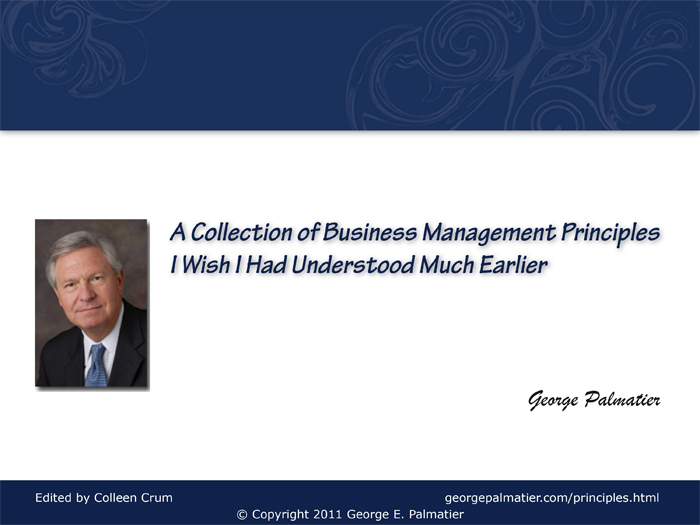 I have been extremely fortunate over my career to have been able to learn from a number of executives, managers, professors, fellow associates, authors and laymen alike. Below, I have attempted to capture some of the many principles that have been shared with me. I make no claim to authorship of the individual principles, and indeed I have attempted to give credit when I know the original source. I claim only to have captured them to share with my friends and clients.